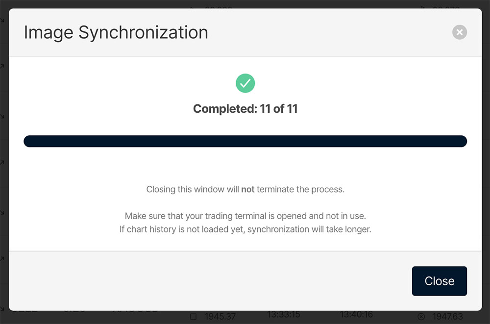 Since MetaTrader limitations don't allow taking screenshots while actively using the terminal, it's an incredibly convenient feature. Your trading will never be disturbed - sync only when ready.
